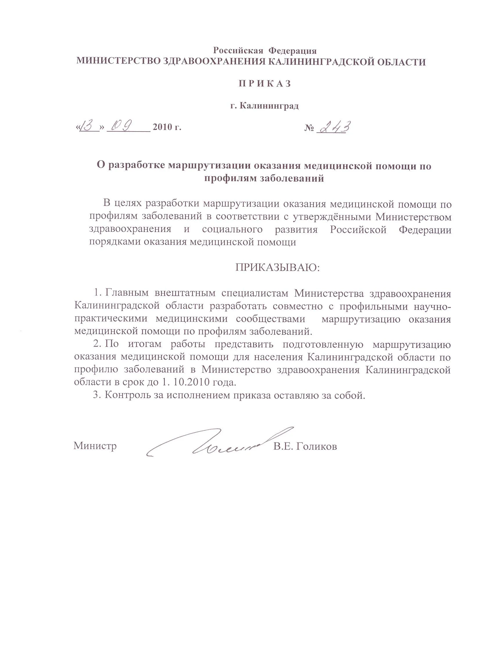 | Приказ Министерства здравоохранения Калининградской области от 13 сентября 2010 г. N 243 Опубликован 14.09.2010 |