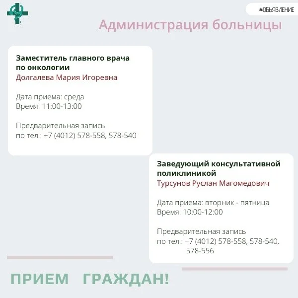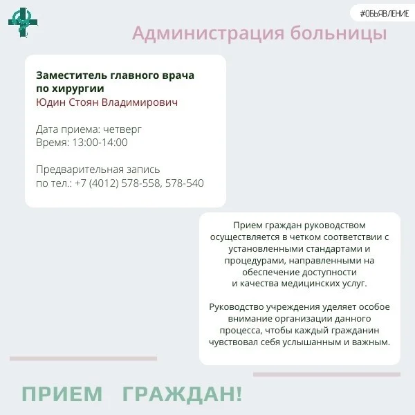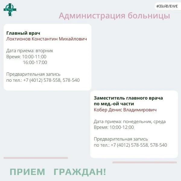 +7 (4012) 99-44-82 (хирургический профиль, оториноларингология, терапевтический профиль);