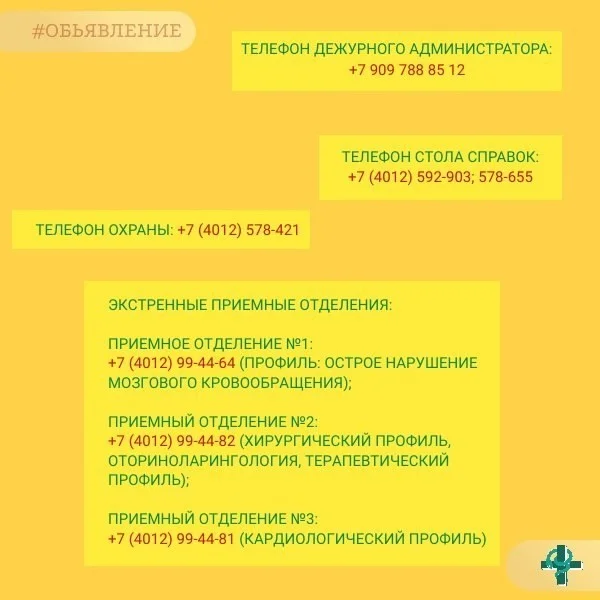 +7 (4012) 99-44-82 (хирургический профиль, оториноларингология, терапевтический профиль);