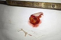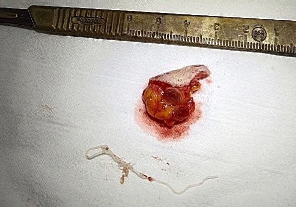 Во время операции после рассечения кожи и подкожной клетчатки хирургами обнаружен инкапсулированный узел, а при его вскрытии - живой гельминт нитевидной формы длиной около 8 см.